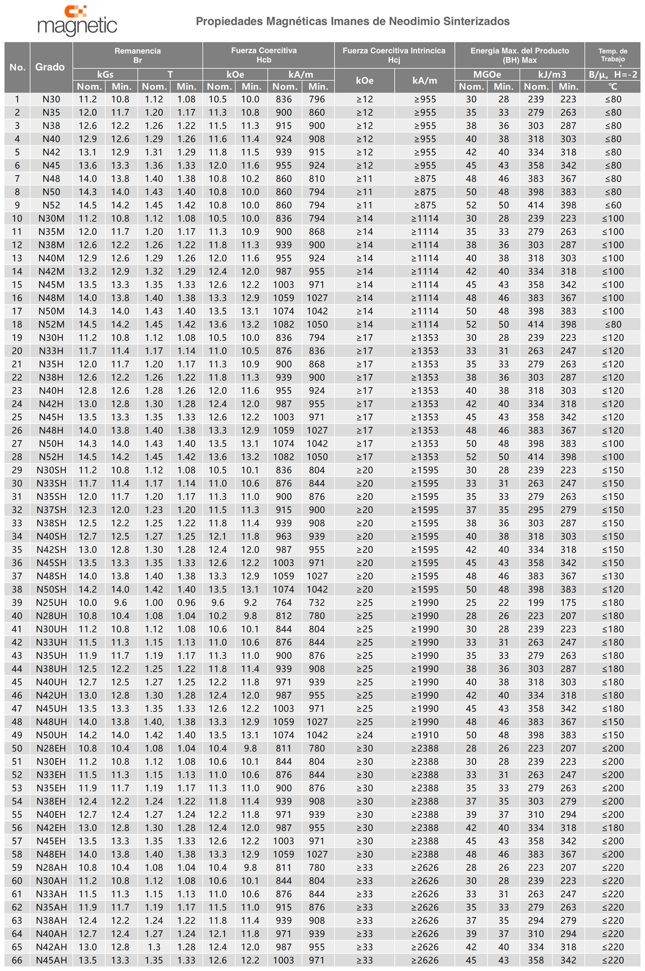 Características Magnéticas disponibles para Imanes a la medida.